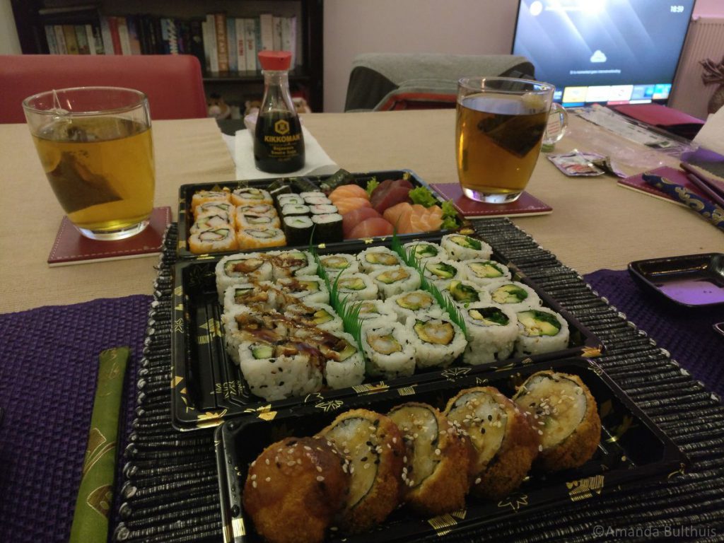 Op vrijdagavond wisten we dus al dat we een weekend zonder internet tegemoet gingen. Als troost mochten we van onszelf daarom sushi bestellen. We bestelden bij Yang Yang Sushi in Eindhoven. We hadden een set met verschillende soorten en sushi en daarnaast een rol met paling (favoriet van Jordan) en twee vegetarische rollen. Allemaal heel lekker.